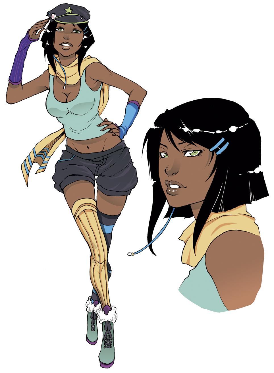 Kim veste uma regata turquesa curta, um short preto com um detalhe azul no bolso e é possível ver outro short azul por baixo. Ela usa um cachecol amarelo com várias listras azuis na ponta e duas meias diferentes: uma amarela com listras finas verticais na perna direita e uma preta com listras azuis horizontais na perna esquerda. Além disso, ela usa dois arm warmers azuis com listras roxas nas pontas, porém o do braço direito também possui listras verticais roxas em toda sua extensão.